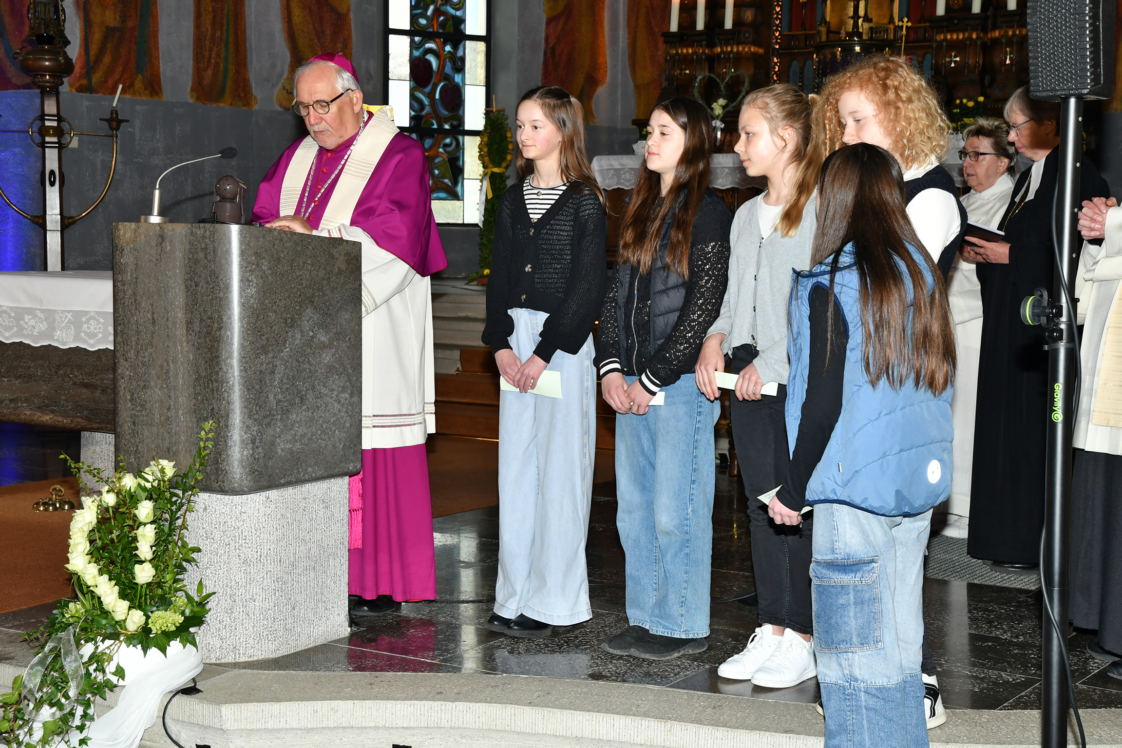 „Damit Leben gelingt“ – Sinnsuche zwischen Angst und Perspektive war das Thema des ökumenischen Gottesdienstes, zu dem als Zelebranten Bischof Gebhard Fürst und Prälatin Gabriele Wulz gekommen waren. Pfarrer Andreas Braun und Schulleiter Stefan Willbold begrüßten die Anwesenden, zu denen Eltern, Schülerinnen und Schüler, aber auch Persönlichkeiten aus Politik, Kirchen und den Schulträgern zählten. Eindrucksvoll führten im Gottesdienst Schülerinnen und Schüler der Klasse 6b unter der Leitung von Claudia Rieg und Tilman John vor Augen, mit welchen Sorgen, Ängsten und Nöten Kinder und Jugendliche zu kämpfen haben. Hintergrund des szenischen Spiels bot der Evangeliumstext um die Erscheinung Jesu auf dem Weg nach Emmaus. Mit Blitz und Donner baute sich über den Jugendlichen eine Projektion auf, die schlagwortartig die Bedrohungen visualisierte. Sowohl hier, als auch in den Dialogen waren O-Töne von Schülerinnen und Schülern verarbeitet worden, die sich mit dem Thema im Morgenkreis auseinandergesetzt hatten. Anschließend stellte Prälatin Gabriele Wulz die Frage, wer uns so sicher mache, dass wir jenseits der Angst tatsächlich neue Perspektiven finden könnten? In ihrer Predigt machte sie deutlich, dass da nun Vertrauen und Zuversicht nötig sei. Der Auferstandene sei mit auf dem Weg, auch wenn nicht zu spüren sei, dass er da ist. Die Geschichte der beiden Emmausjünger zeichne ein Bild von Kirche, die da ist, wo Enttäuschte, Verunsicherte und Zerbrochene zusammenfänden. Erst im Rückblick werde klar, wer da mit ihnen auf dem Weg war. Im weiteren Verlauf wurde Brot, selbst gebacken von Schülerinnen und Schülern, gesegnet, das im Anschluss an den Gottesdienst miteinander geteilt werden konnte. In der Schlusszene machten die Schüler im Dialog noch einmal deutlich, was ihnen Hilfe und Stütze in diesen herausfordernden Zeiten sein kann. Bändchen mit dem Motto des Gottesdienstes „Damit Leben gelingt“ wurden als Segenszeichen an die Besucherinnen und Besucher verteilt. Stimmungsvoll gestaltete der Chor und die Instrumentalisten des Franziskusgymnasiums unter der Leitung von Ralf Löwe den Gottesdienst, der mit einer Orgelimprovisation zum Auszug einen furiosen Abschluss fand. Beim anschließenden Empfang im Gemeindezentrum konnte die Zeit für Begegnung und Gespräch genutzt werden.