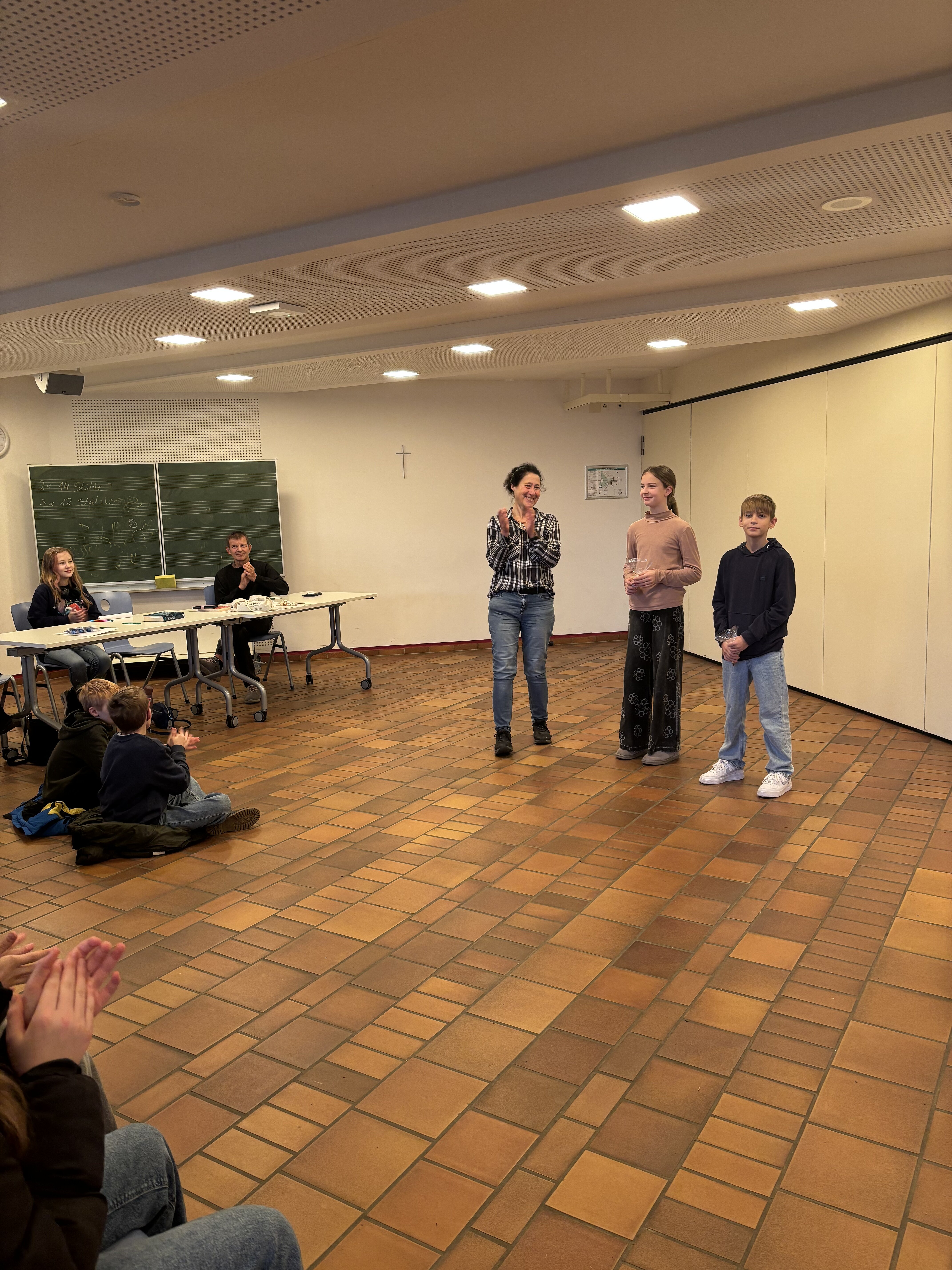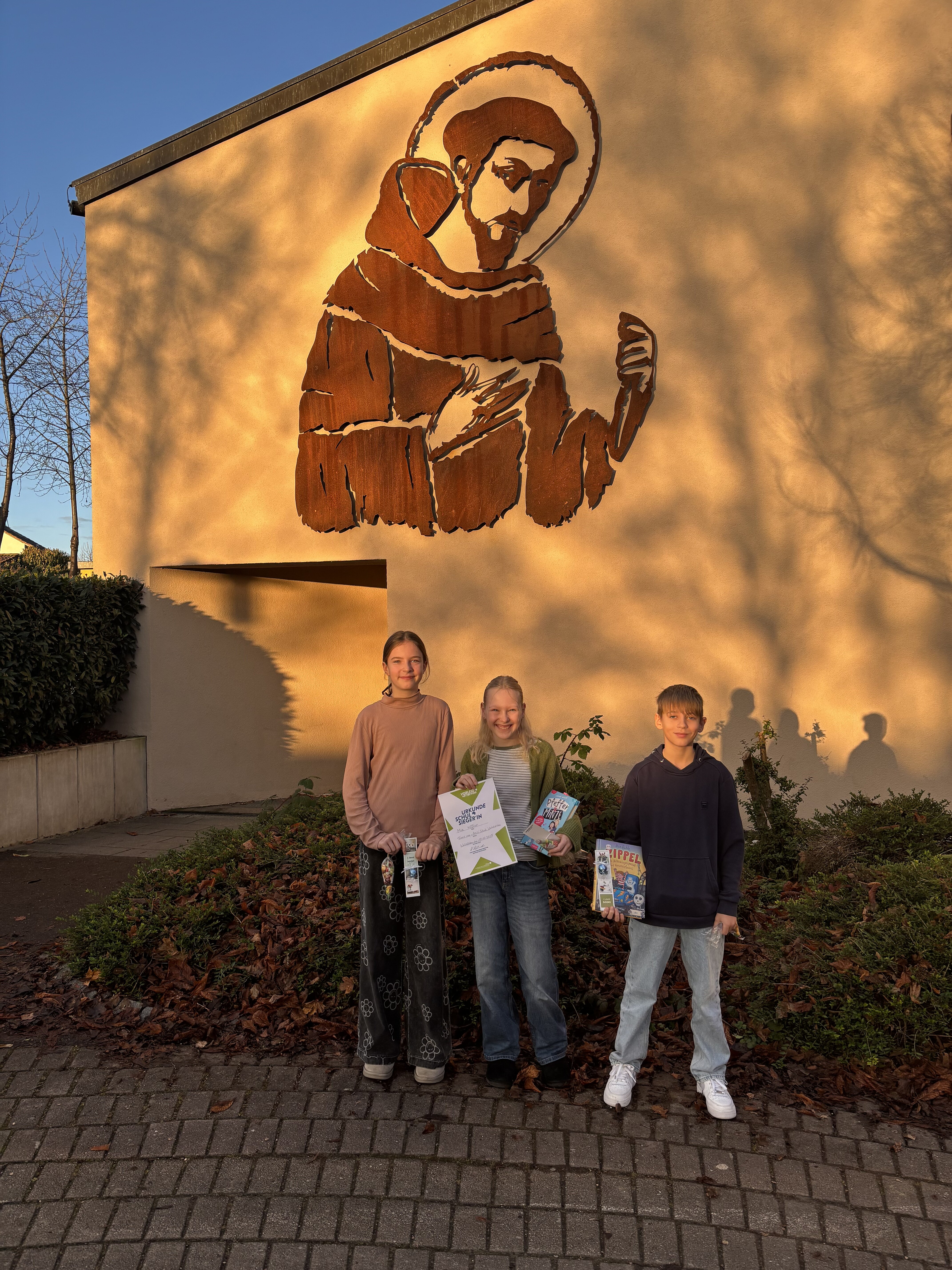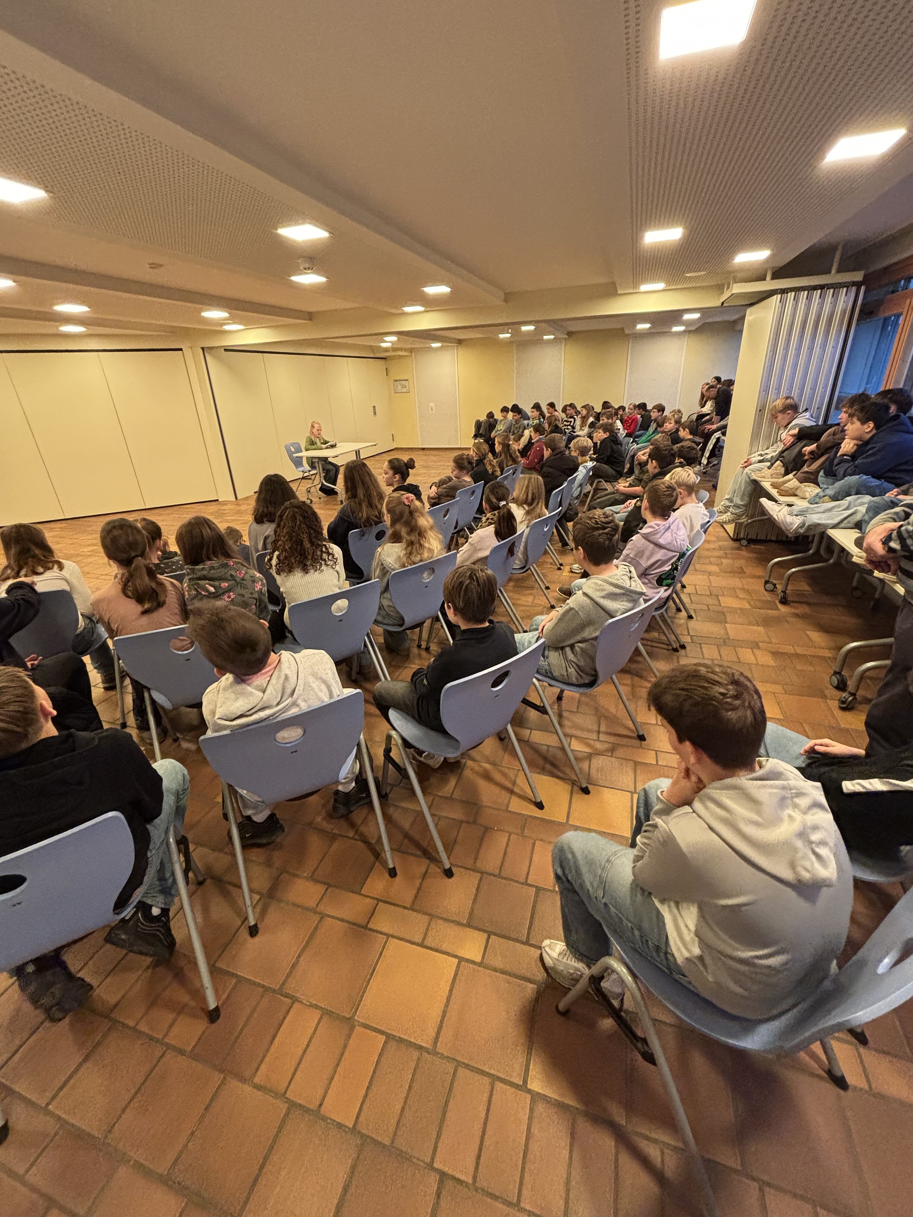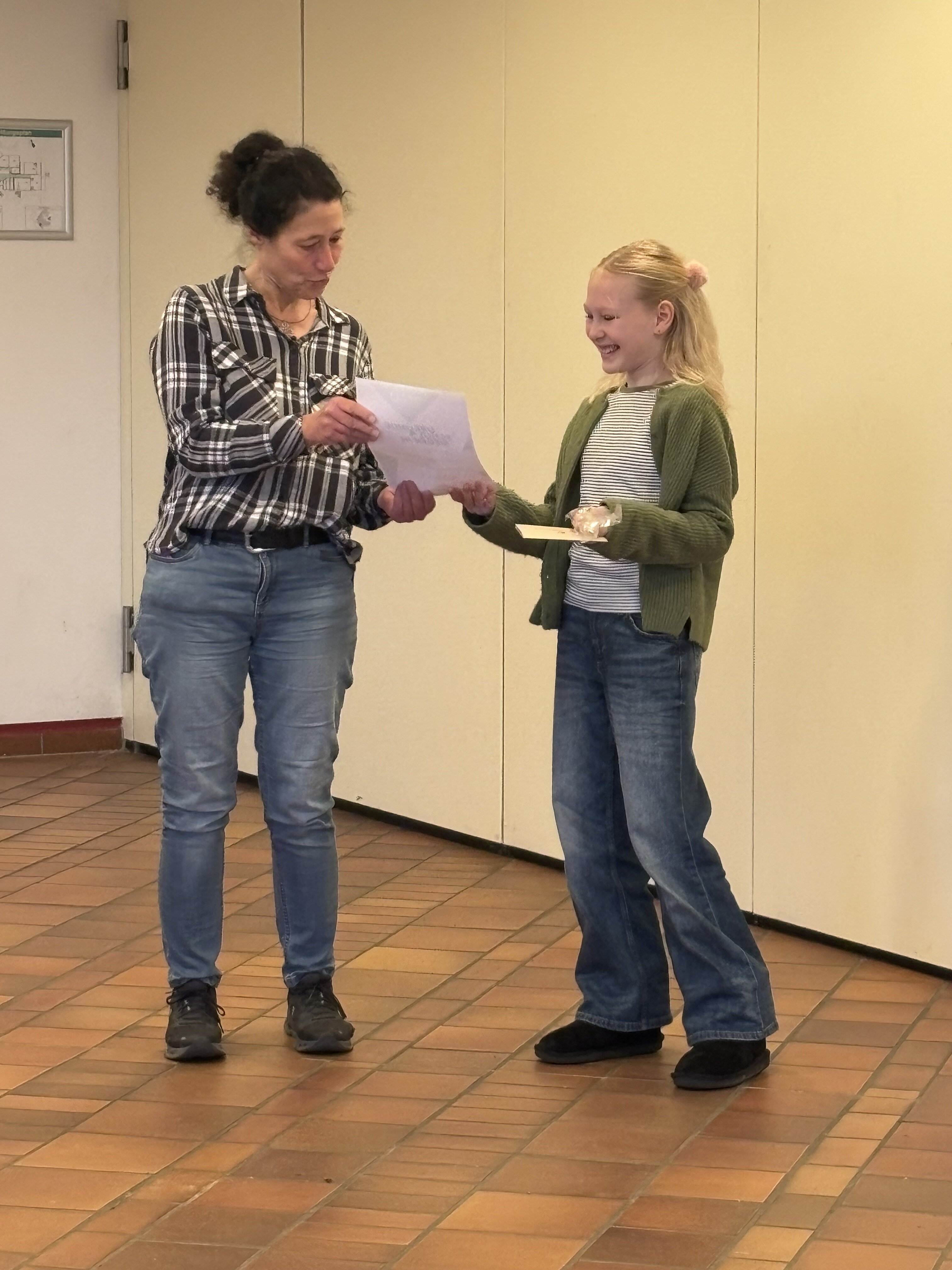 Am 10. Dezember 2025 fand der diesjährige Vorlesewettbewerb der 6er-Klassen in unserer Aula statt. Dieser Vorlesewettbewerb lädt alle Schülerinnen und Schüler der sechsten Klassen ein, ihre Lieblingsgeschichten zu präsentieren. Hochmotiviert starteten die drei Klassengewinnerinnen aus den Klassen 6a, 6b und 6c jeweils mit dem Vorlesen eines Auszugs aus ihrem Lieblingsbuch. Unterstützt wurden die drei Schülerinnen dabei jeweils von ihren Mitschülerinnen und Mitschülern, die ihre Klassengewinnerin zu Beginn lautstark anfeuerten. Im zweiten Durchlauf mussten die drei Kandidatinnen anschließend jeweils einen Auszug aus einem Fremdtext präsentieren. Alle drei Schülerinnen erbrachten starke Leistungen, die auch entsprechend mit einer Urkunde, einem Buchgutschein und weiteren Preisen belohnt wurden. Letztendlich ging mit einem hauchdünnen Vorsprung die Kandidatin aus der Klasse 6b als diesjährige Schulsiegerin aus dem Wettbewerb hervor. und darf sich nun freuen, ihre Schule in der nächsten Vorleserunde im Stadtkreis vertreten zu können.