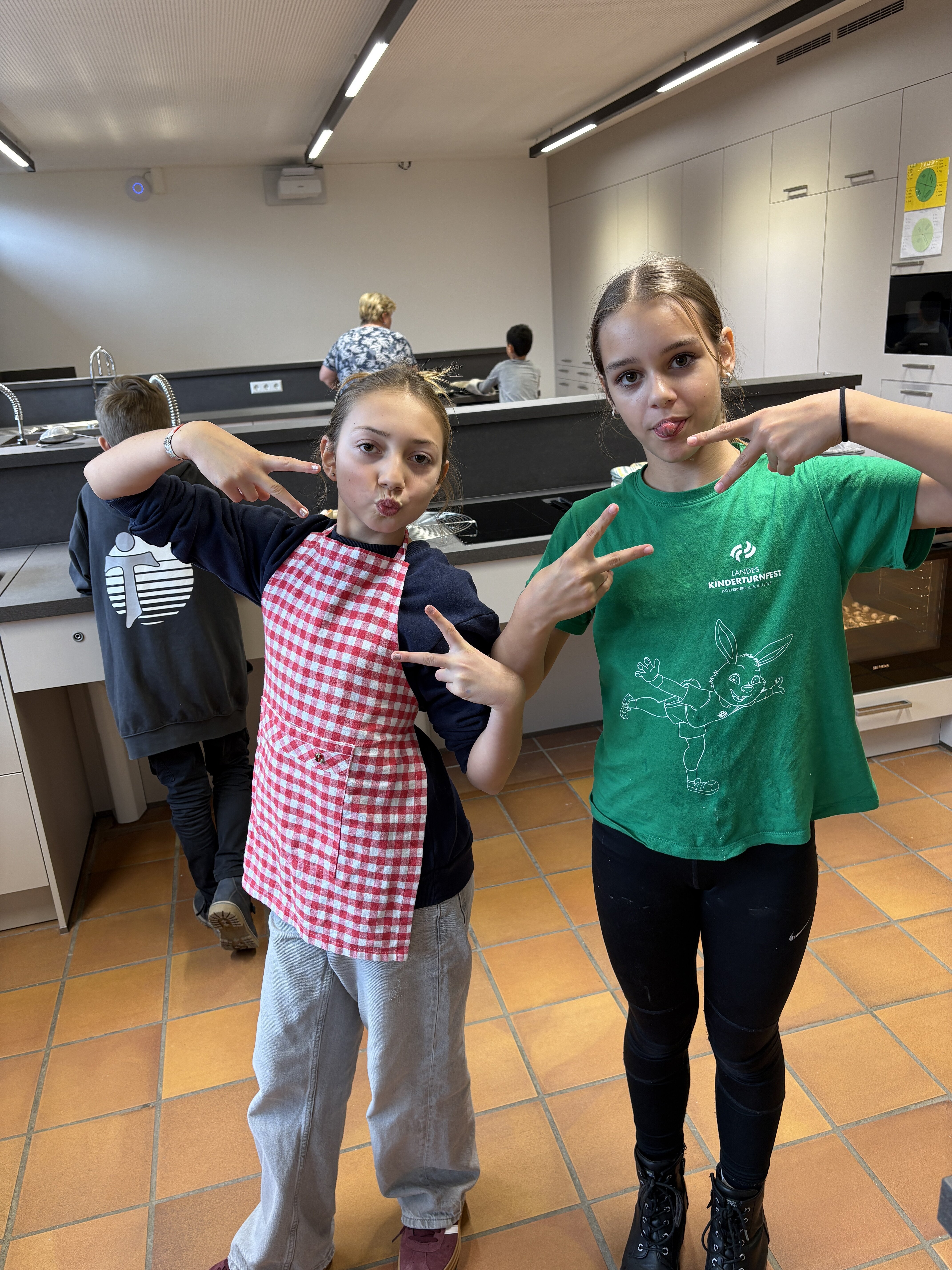 Anschließend ging es auf den Hartplatz zum Kicken. Nachdem sich alle ausgepowert hatten, machten sich die Kinder mit ihren Betreuerinnen hungrig auf den Weg in die Schulküche. Dort kochten sich alle gemeinsam ein leckeres Abendessen: Gemüsesticke, Pizza und einen leckeren Nachtisch.