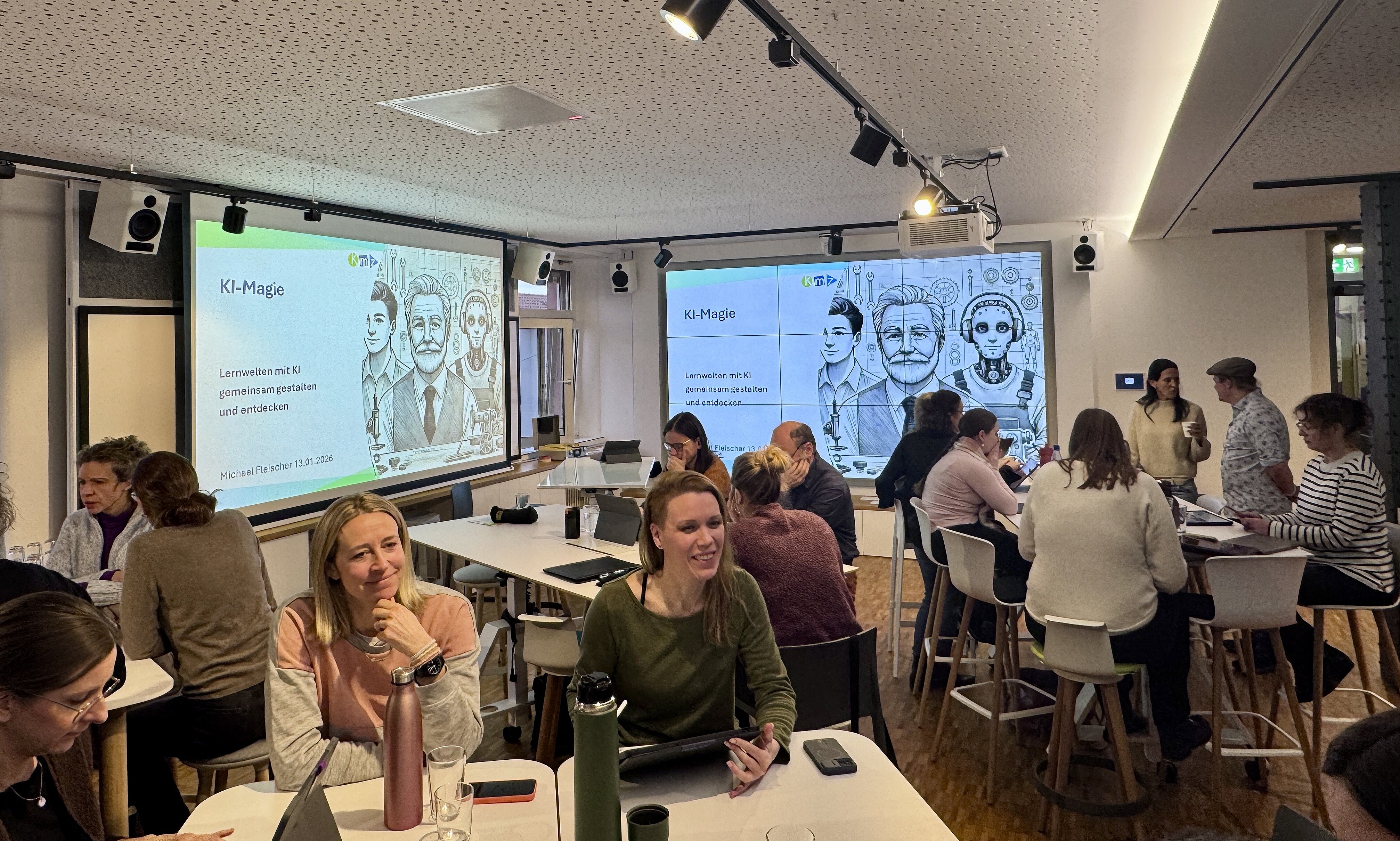 Der erste Fortbildungstag fand in den Räumen der Franz-von-Assisi-Schule statt. Nach einer gemeinsamen Einführung wurden grundlegende Fragen in den Blick genommen: Was ist Künstliche Intelligenz eigentlich, wie funktioniert sie, und welche technischen, wirtschaftlichen und gesellschaftlichen Auswirkungen hat sie auf Bildung? In Impulsen und Reflexionsphasen ging es dabei nicht nur um KI als neues Werkzeug im pädagogisch-didaktischen „Werkzeugkoffer“, sondern auch um die Frage, wo in einer zunehmend digitalisierten Welt der Mensch bleibt. Ein besonderer Schwerpunkt lag auf dem christlich geprägten Menschenbild der Schule, das Beziehung, Würde und Verantwortung in den Mittelpunkt stellt.