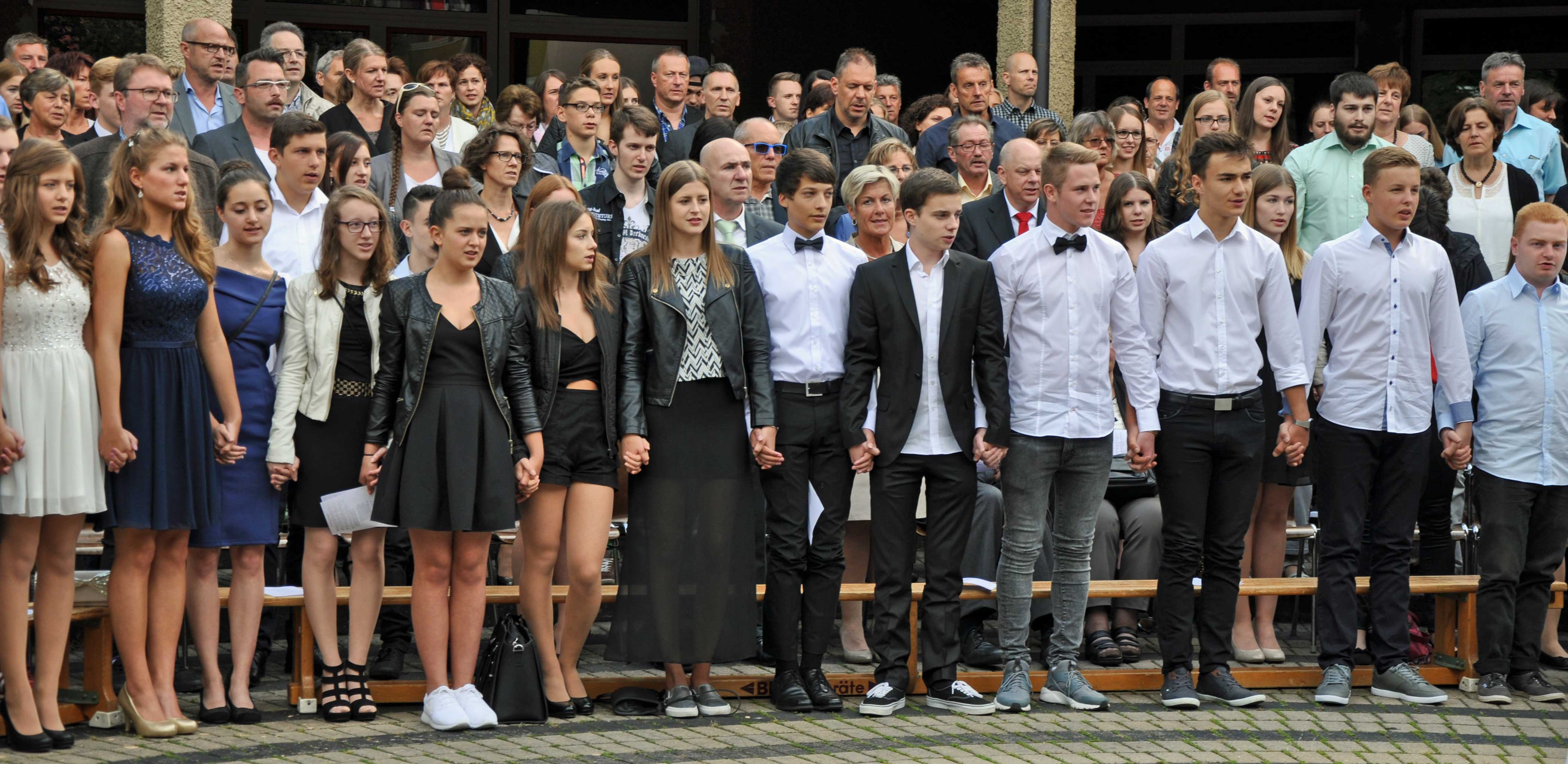 Traditionell fand der offizielle Teil der Schulentlassfeier im Freien statt. Nach dem Gottesdienst, den die Klasse 10c vorbereitet hatte, und von den beiden Geistlichen Diakon Weiss und Pfarrer Krieg von der evangelischen Gemeinde zelebriert wurde, nahm Schulleiter Stefan Willbold die Schulentlassung vor. Geehrt wurden die Schulbesten durch Bürgermeister Michael Rembold und dem Schulleiter war es eine besondere Freude, den Bischof-Sproll-Preis der Diözese Rottenburg-Stuttgart an Line Abele verleihen zu können. Darüber hinaus fand er auch Worte des Danks an die vielen Beteiligten dieser Gesamtleistung: Eltern, Elternbeiräte, Kolleginnen und Kollegen, Mitarbeiterinnen im Tagheim, Küche, Hausmeister und Sekretärin sowie das Reinigungspersonal. Bei der Übergabe der Zeugnisse wurde in den Worten der Klassenlehrer deutlich, welche Beziehung hier über die Jahre gewachsen ist. Auch in den Beiträgen der Schülerinnen und Schüler im Anschluss beim gemütlichen Teil in der Stuifenhalle wurde deutlich, dass es ihnen schwer fällt, Abschied zu nehmen. Dies kam in vielen berührenden Momenten zum Ausdruck.